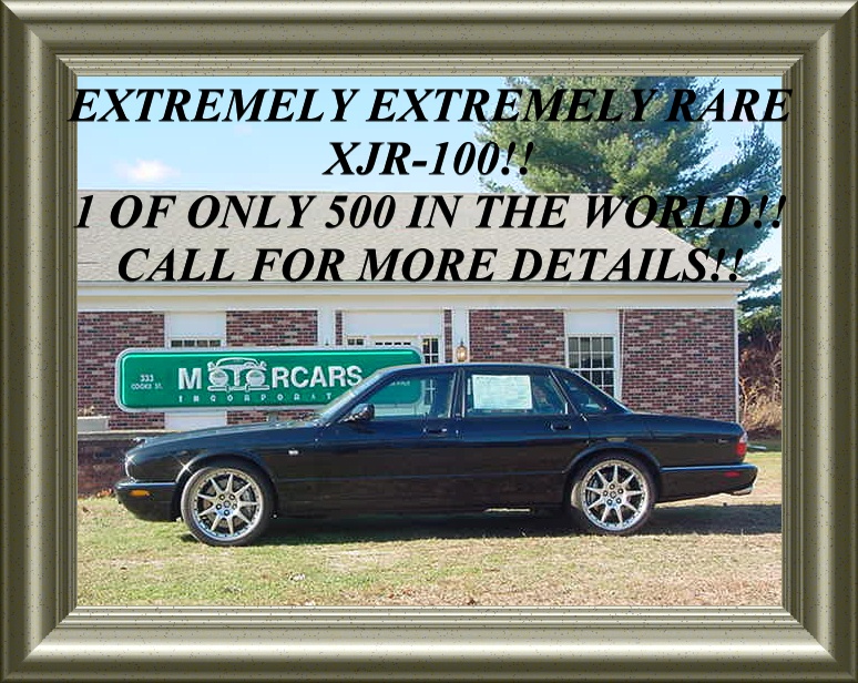 | | Vehicle Description: WOW!! YES!! THIS IS A REAL XJR-100!! ONE OF ONLY 500 MADE IN THE WORLD. THE SIR WILLIAM LYONS CENTENIAL TRIBUTE EDITION WITH THE MOST SPECIAL ATTENTION TO DETAIL AS POSSIBLE. 370 H.P. SUPERCHARGED 4.0L V8!! BLACK ON BLACK WITH COLOR CODED BLACKED OUT WINDOW TRIM, SPECIAL RED STITCHING INTERIOR WITH GRAY STAINED BIRD'S EYE MAPLEWOOD DASH AND TRIM HUGE PAINTED BREMBO CALIPERS (WITH SUCH DETAIL AS EVEN THE JAGUAR LOGO ON THEM)AND HUGE CROSS DRILLED ROTORS ALL RIGHT FROM THE FACTORY!! THIS IS THE JAGUAR OF ALL JAGUARS! LOADED WITH BEST OF EVERYTHING THAT JAGUAR CAN PUT IN A CAR. SPECIAL 19 INCH TWO PIECE "MONTREAL" BBS 9 SPOKE ALUMINUM ALLOYS WITH PIRELLI P-ZERO ASYMETRICALS, NAVIGATION SYSTEM, A 320 WATT PREMIUM ALPINE STEREO WITH CASSETTE AND CD CHANGER, A THICKER RACING INSPIRED MULTI-FUNTION LEATHER WRAPPED STEERING WHEEL AND MORE. CALL TOLL FREE 800-899-1055. DO NOT MISS OUT ON THE OPPORTUNITY TO OWN SUCH A HISTORICAL AND INVIGORATING MOTORCAR!! TREAT YOURSELF TO THIS SPECIAL AND RARE PIECE OF AUTOMOTIVE HISTORY.